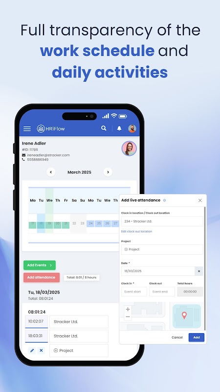 HRiFlow est une solution intelligente qui simplifie et rationalise la gestion des RH. Grâce à son interface intuitive, la plateforme permet un suivi en temps réel des présences et des horaires de travail, garantissant ainsi la transparence de la gestion des effectifs. La gestion des congés est simplifiée grâce à un système de demande et d'approbation numérique, et les documents essentiels tels que les certificats médicaux et les déclarations officielles sont toujours accessibles. De plus, HRiFlow optimise la gestion des équipes, enregistre clairement les jours de congés et les heures supplémentaires, et facilite l'organisation des projets et l'évaluation des employés. Toutes ces fonctionnalités s'intègrent parfaitement dans une plateforme moderne conçue pour répondre aux besoins de toute entreprise.