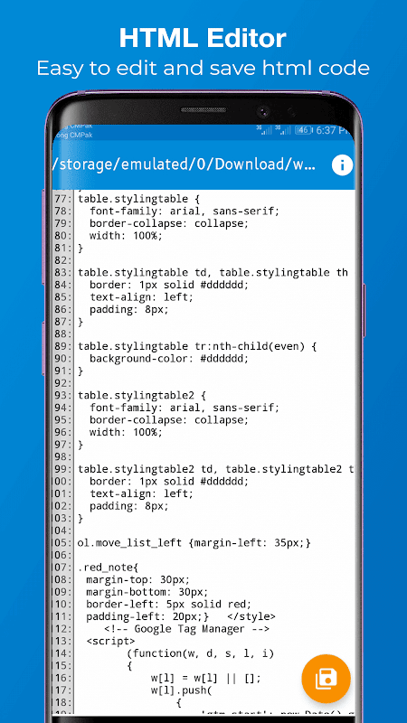 Grâce à l'éditeur html, vous pouvez facilement modifier le code source de n'importe quelle page et l'enregistrer dans le stockage de votre appareil. La visionneuse HTML ou le lecteur HTML vous permettra non seulement d'obtenir le code source d'une page, mais vous permettra également de visualiser la page dans WebView à quoi ressemble réellement la page.