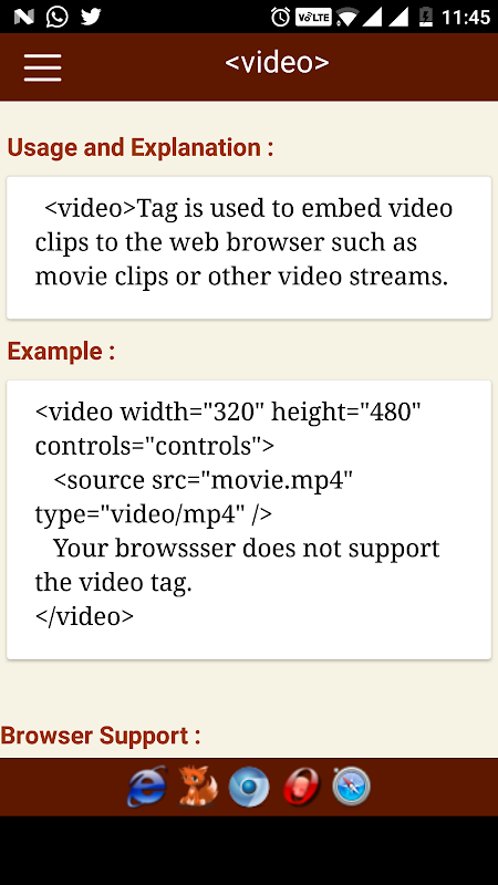 Les balises HTML sont classées et consultables. Chaque écran d'information de balise contient une description, élément des attributs spécifiques, des exemples, la compatibilité du navigateur, et la version. De plus, la plupart des exemples comprennent la sortie rendue réelle.