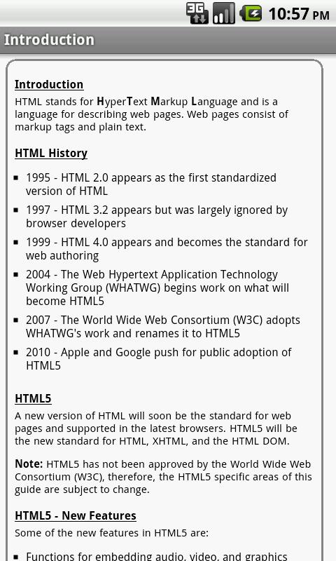 Note: This app contains HTML4 information, but the goal is to focus on HTML5. As the HTML5 specification progresses towards approval, updates to this app will follow those changes and evolve toward the HTML5 spec.