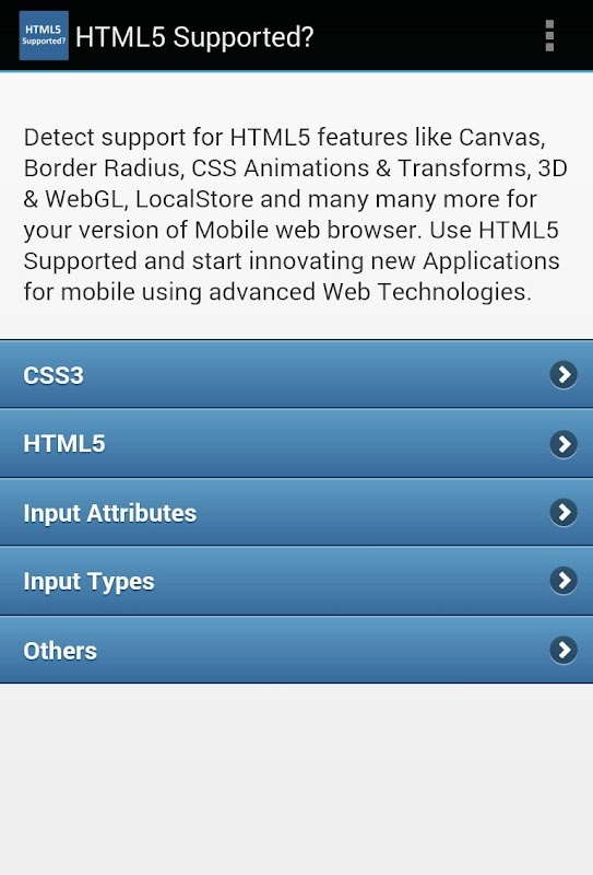 Ne vous inquiétez pas, installez cette grande App 'HTML5 soutenu' sur votre mobile et lancer des fonctionnalités de détection. Pas plus recherche sur le web pour la détection de support de fonctionnalité pour les appareils Android.