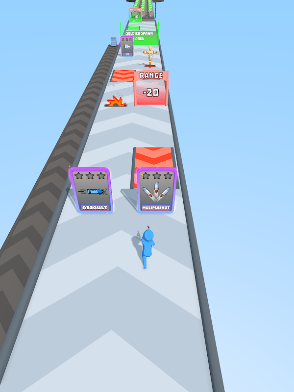 Collectez toutes les cartes et regardez-les se transformer de carte en soldat dans la zone d'apparition des soldats. Remplissez la barre d'évolution à gauche en tirant sur les épouvantails devant vous et faites évoluer le commandant !