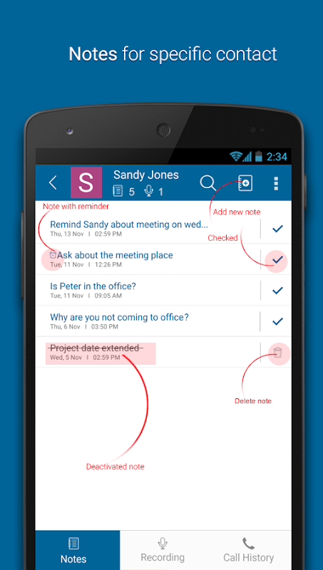 Joindre des notes aux contacts, les voir quand vous obtenez / faire un appel de / vers le contact