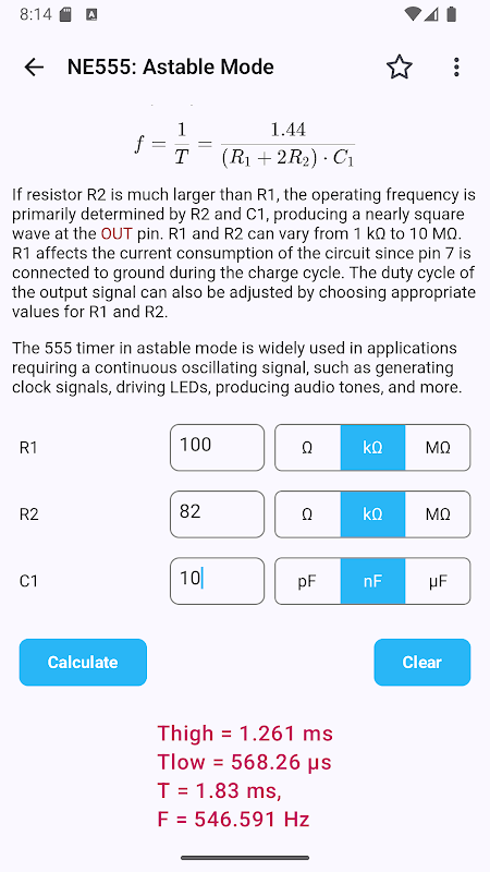 Outre les tutoriels et les schémas, l'application intègre des calculateurs de fréquence, de temporisation, de rapport cyclique et d'estimation de la valeur des composants, permettant aux utilisateurs de calculer et d'ajuster rapidement les paramètres des circuits. Tous les sujets sont présentés avec des schémas de circuits clairs et des explications détaillées.