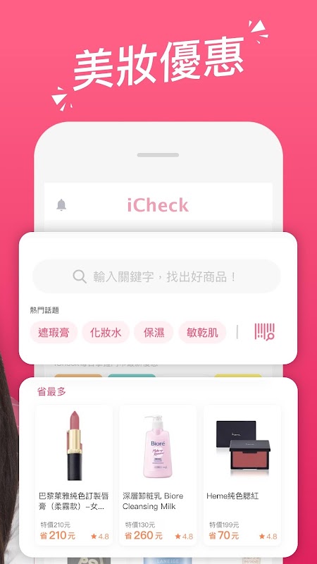 最多人用的美妝優惠分享平台,快加入回報優惠資訊的行列,一起花小錢、變漂亮!有折扣 iCheck 會立刻通知你,讓你買在最便宜~
