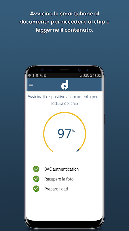 L'application, disponible pour les smartphones équipés du système d'exploitation Android et de l'interface NFC, effectue une numérisation optique de la zone lisible par machine (MRZ) d'un document électronique, c'est-à-dire la zone composée de 2 ou 3 lignes alphanumériques contenant certaines des informations imprimées dans le visible. partie du document.