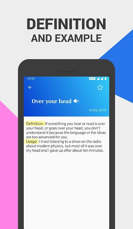 Explorez chaque jour de nouveaux idiomes et expressions difficiles. Apprenez-les et exprimez-vous mieux. Tous les idiomes et les phrases sont choisis avec soin et parmi les meilleures sources. Vous pouvez mettre en signet votre expression ou phrase préférée pour y accéder rapidement par la suite.