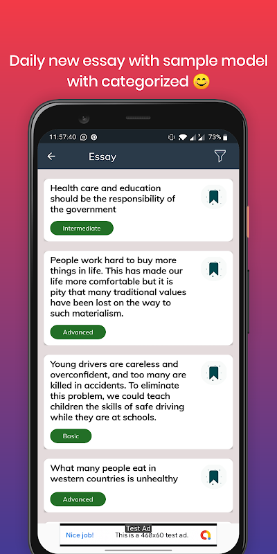 IsC'est plus qu'une simple collection d'essais IELTS à haut score.Dans IELTS Essay Preparation, vous obtiendrez des essais avec des types courts comme des essais de base, intermédiaires et avancés et qui seront faciles à décider pour les ielts écrivant une pratique avec essai. vous fournir un essai quotidien sélectionné avec des notifications et du vocabulaire dans les mises à jour à venir, vous garder toujours engagé.