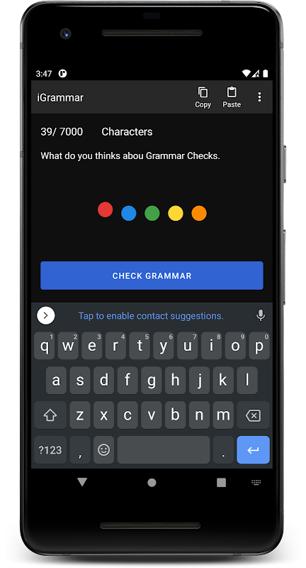 iGrammar est un vérificateur de grammaire et de style anglais et il a été développé après les efforts de collaboration intenses d'écrivains, de développeurs et de concepteurs professionnels où vous pouvez exécuter une vérification grammaticale de n'importe quel contenu de texte. Lettres, e-mails, essais ou histoires, peu importe ce que vous leur donnez à corriger, car aucune erreur ne peut échapper à cette application de vérification de grammaire. Devenez plus confiant dans votre écriture et apprenez des explications des corrections fournies par l'application.