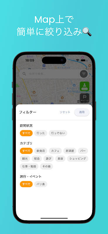 ・Confirmer dans la liste et sur la carte : les spots peuvent être confirmés dans l'affichage de la liste ou sur la carte. Faites facilement des projets et revenez sur vos souvenirs.