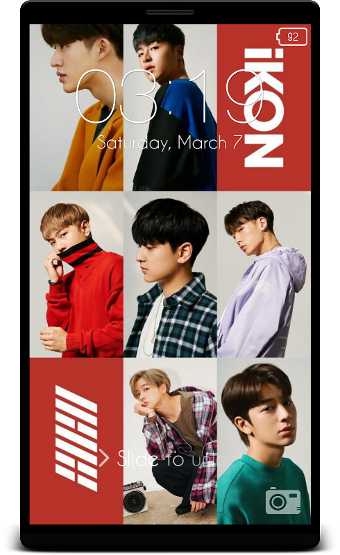 This lock screen is based on iKon theme. There are many iKon HD backgrounds in this app. You can unlock your phone using different methods like Slide to unlock, enter passcode, draw pattern, pin, etc.