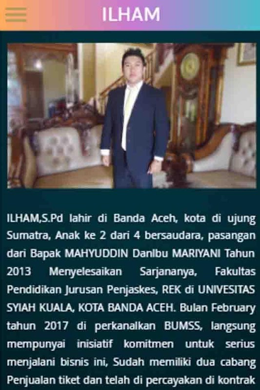 ILHAM,S.Pd lahir di Banda Aceh, kota di ujung Sumatra, Anak ke 2 dari 4 bersaudara, pasangan dari Bapak MAHYUDDIN Dan Ibu MARIYANI Tahun 2013 Menyelesaikan Sarjananya, Fakultas Pendidikan Jurusan Penjaskes, REK di UNIVESITAS SYIAH KUALA, KOTA BANDA ACEH. Bulan February tahun 2017 di perkanalkan BUMSS, langsung mempunyai inisiatif komitmen untuk serius menjalani bisnis ini, Sudah memiliki dua cabang Penjualan tiket dan telah di percayakan di kontrak instasi pemerintahan untuk penjualan tikket maskapaipenerbangan.