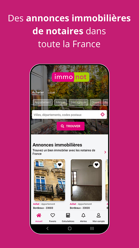 Immonot est la seule application gratuite qui vous propose des annonces immobilières exclusivement de notaires.