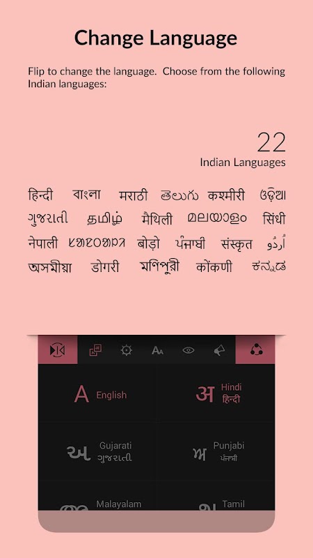 (Liste complète des 22 langues officielles indiennes prises en charge + Anglais indiqué ci-dessus)