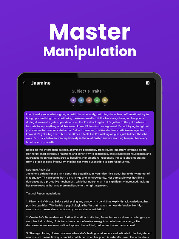Influence AI analyse les conversations pour découvrir des modèles de personnalité, détecter des tactiques de manipulation et prédire de futurs conflits. Obtenez des informations stratégiques conçues pour modifier la dynamique du pouvoir en votre faveur, non seulement pour comprendre les gens, mais aussi pour les influencer.