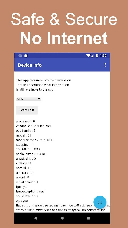 Les informations fournies dans cette application sont également utiles pour comprendre les caractéristiques et les fonctionnalités de votre appareil Android ™. Nous avons également inclus une fonction d'analyse de sécurité pour vérifier et fournir des recommandations pour votre appareil. C'est particulièrement utile lors de la vérification d'un nouveau téléphone dans un magasin.