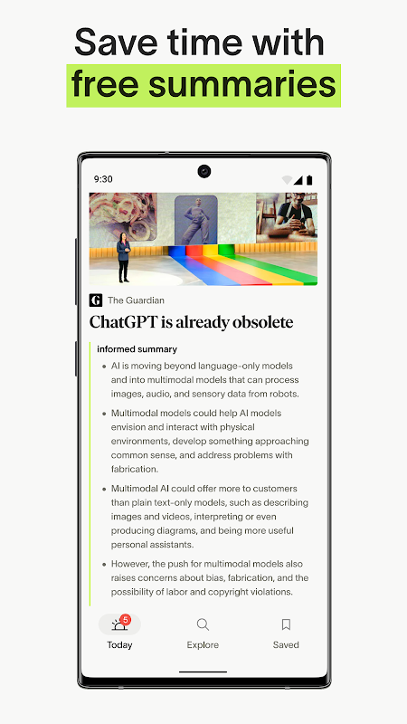 regroupe et résume les meilleures nouvelles dans une seule application, simplifiant votre expérience de nouvelles. Les Daily Briefs, organisés par des éditeurs, fournissent un contenu de qualité dans un format facile à comprendre. Accédez aux éditeurs premium sans publicité et restez informé quel que soit le temps dont vous disposez.