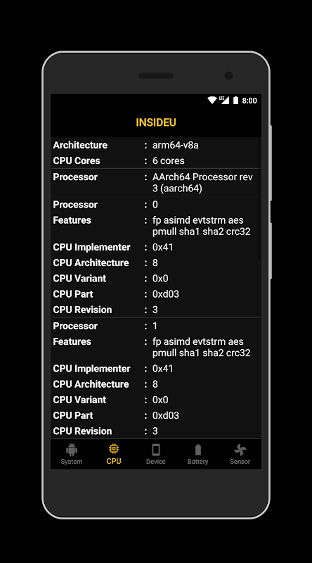 INSIDEU renseigne sur appareil comme processeur, noyaux, vitesse, modèle, ram, capteurs, etc. Pas comme d'autres applications CPU Info, INSIDEU peut également vérifier l'accès ROOT.