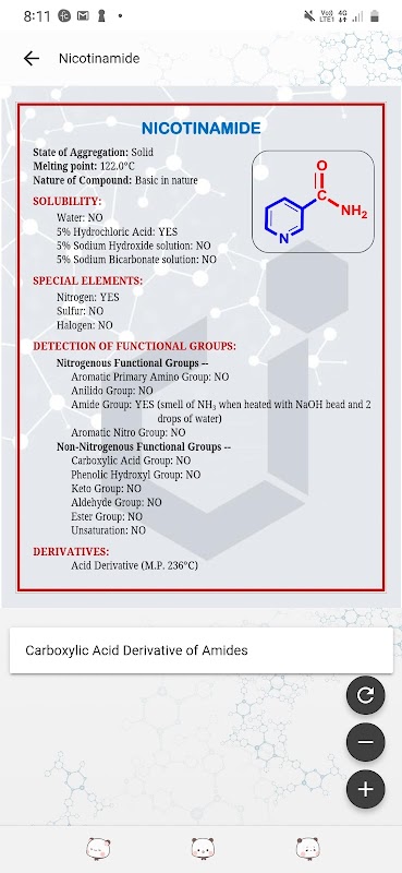 Le programme est une base de données en constante expansion, comprenant actuellement plus de centaines d'échantillons organiques ainsi que leurs données physiques pertinentes, leur comportement chimique et des méthodes détaillées couvrant une gamme de formation de dérivés pour chaque échantillon. Cet outil est mis à disposition pour parcourir l'ensemble de données, glaner des détails expérimentaux pertinents et tester vos compétences en chimie organique dont vous aurez besoin pour identifier le composé organique inconnu attribué.