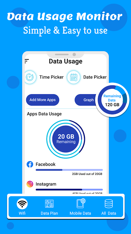 You can set whatever you want like daily, weekly, monthly, quarterly and yearly data usage statistics. It will show in table as well as in graphs and will indicate about the usage. You can settle with the setting (Wi-Fi, 3G, 4G, 5G) and show how much you can use.