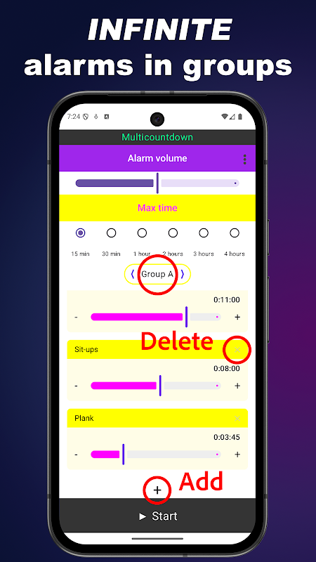 Idéal pour vos entraînements, la cuisine, le sport, les séances d'intervalle, les répétitions, comme minuteur de scène ou pour toute autre activité nécessitant un chronométrage. Les alarmes retentissent au début de chaque intervalle. Affichez les noms des alarmes et de grands chiffres !