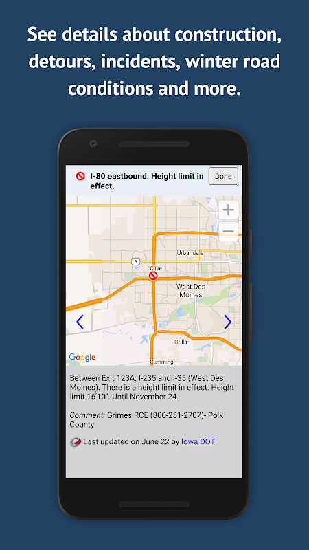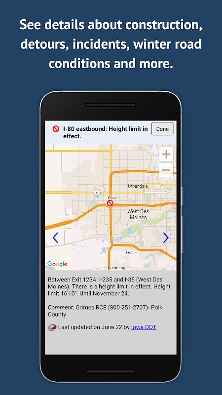 • Near real-time updates on winter road conditions, truck restrictions, traffic incidents, construction, and road closures