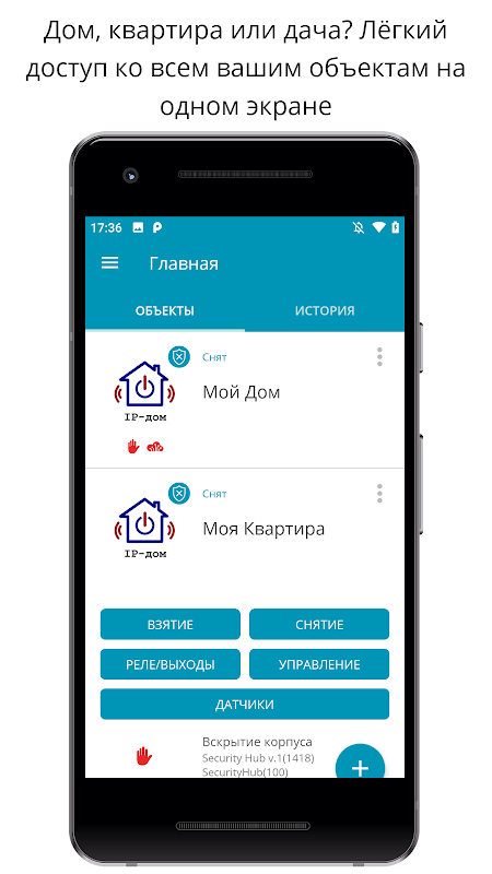 - постановка/снятие с охраны всего объекта и/или отдельных помещений как с пульта, так и из приложения