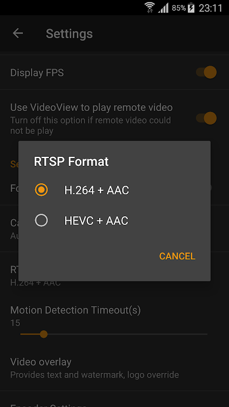 L'utilisation de HEVC pour l'enregistrement/le streaming vidéo nécessite Android 5.0 ou supérieur, et l'appareil doit prendre en charge le codec HEVC.