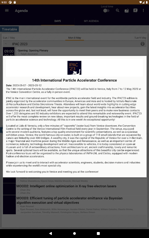 L'application IPAC23 fournit les informations les plus récentes sur la conférence concernant le programme scientifique ; les séances de l'industrie ; les auteurs; la logistique; exposants et sponsors.