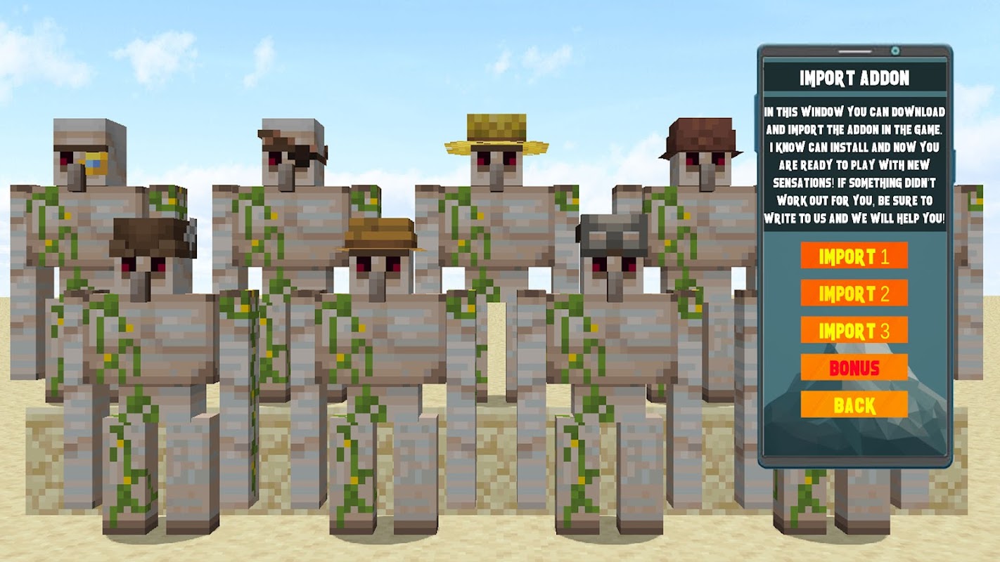 This addon will add to your world a huge amount of interesting and scary Golems for your MCPEl! This addon will make your game much nicer and more convenient!