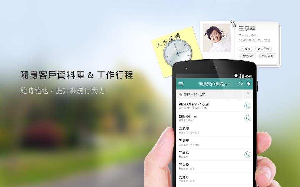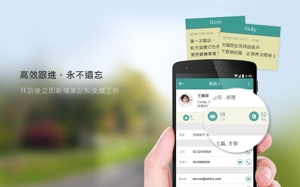 iShelly 是業務必備的隨身客戶資料庫和私人貼身秘書,在移動中也能輕鬆便捷地查詢和聯繫客戶、追蹤來往紀錄、管理工作和行程,有效維護客戶關係,快速提升業務能力!