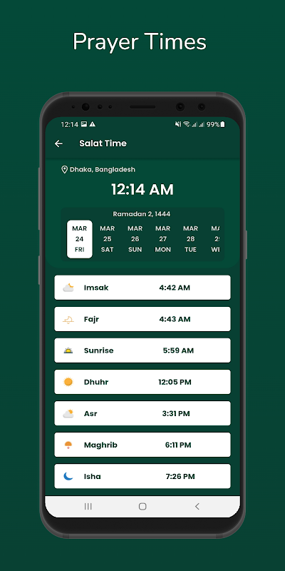 • Fournit des heures de prière correctes dans les grandes villes du monde. Fournit également un calendrier permanent et un calendrier de prières pour chaque district du Bangladesh