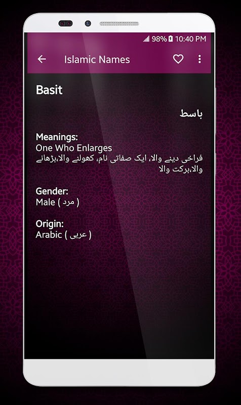 Un enfant musulman, quel que soit son âge, et une personne embrassant l'islam, étaient appelés sous un nouveau nom, probablement en arabe. Les noms des prophètes, les noms combinés avec Asmaul Husna (Noms d'Allah), les noms de l'histoire et les noms traditionnels ou modernes sont utilisés à cet égard. Cette application est un dictionnaire de noms urdu et de noms anglais avec des significations.