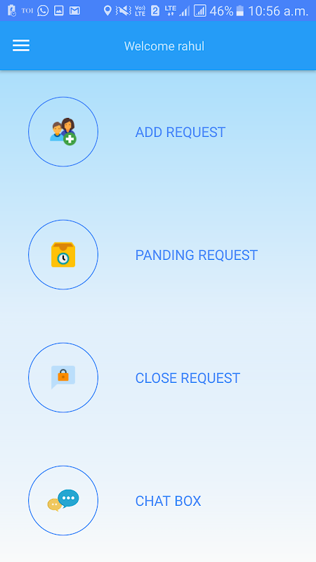 Lorsque l'utilisateur a enregistré / login a réussi une option pour générer ou ajouter une demande de EXIGENCE ou un problème après que le client et le service de peut gérer cette exigence. Dans l'application, si le client ISSUE ou EXIGENCE a été résolu, il montrera à la section de demande de fermeture et de l'application a également les fonctionnalités de rouvrir la demande Fermer