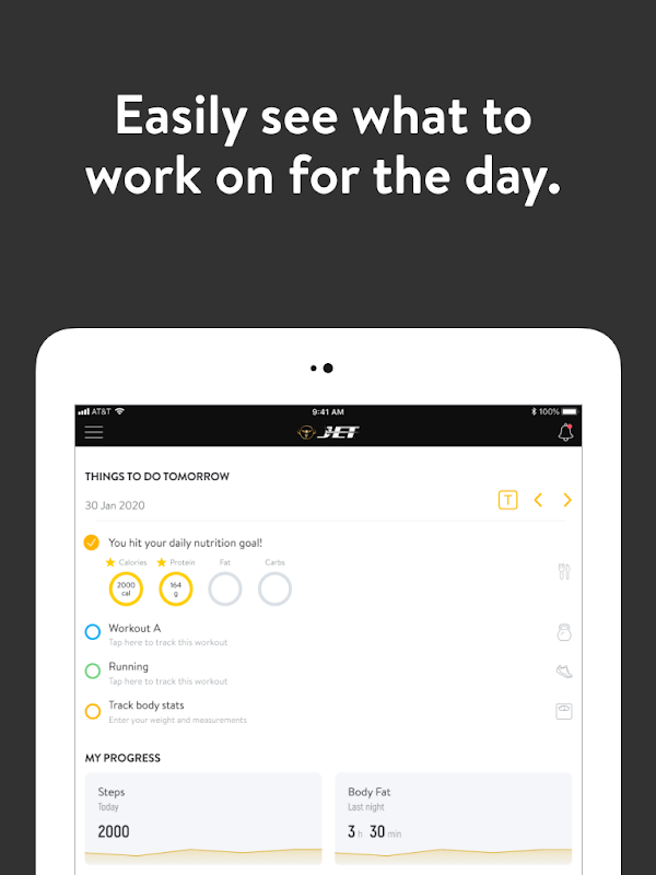 Avec l'application JET Boston, vous pouvez commencer à suivre vos entraînements et vos repas, mesurer les résultats et atteindre vos objectifs de fitness, le tout avec l'aide de votre entraîneur personnel.