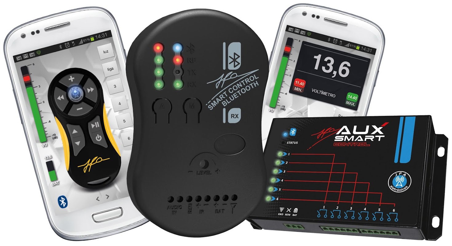 O JFA Smart Control foi projetado para controlar o som do carro a longa distância via Bluetooth e também via controle remoto JFA (necessário central Bluetooth).