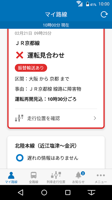 Pour les lignes conventionnelles, les trains express limités et les Shinkansens sous la juridiction de JR West, il y a un retard de plus de 15 minutes pour plusieurs trains sur l'itinéraire enregistré par le client (plus de 10 minutes pour l'heure de pointe du matin dans la région de Keihanshin, Sanyo Shinkansen et Hokuriku Shinkansen) Nous vous informerons des informations sur l'opération par notification push lorsqu'elles se produisent ou sont attendues. En plus de l'itinéraire, de l'heure et du statut de conduite, si vous pouvez vérifier le statut, vous pouvez également vérifier la section affectée, la cause, le temps de reprise estimé lorsque la conduite est suspendue et la mise en œuvre du transfert de transfert. De plus, vous pouvez vérifier la position de circulation des trains individuels sur certains itinéraires.