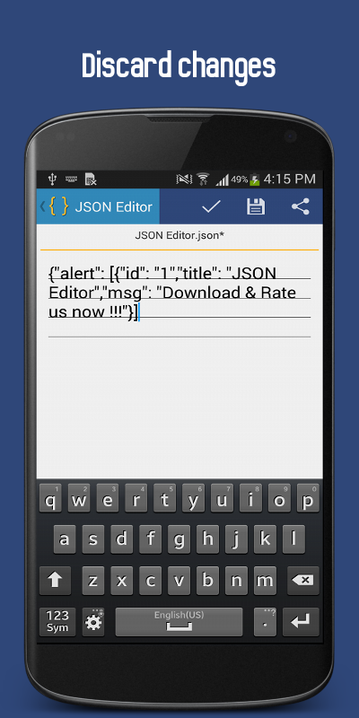 Liste des applications tous les fichiers JSON présents sur le téléphone. Nous pouvons utiliser cette application pour créer, éditer, Téléchargement, Valider et Share (texte) fichiers JSON.