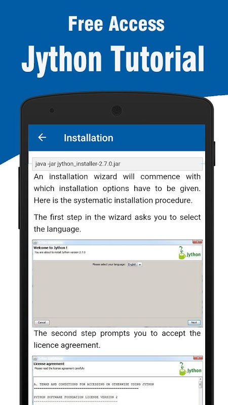 This app will be helpful for Java programmers who want to utilize important features of Python i.e. Simple Syntax, Rich Data Types and Rapid Application Development in Java code. This will also be useful for Pythonistas to import feature Java class library into the Python Environment.This app is made to make the programmers comfortable in getting started with Jython and its various functions.