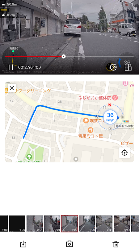 Vous pouvez vérifier la vidéo de l'enregistreur de conduite à partir de l'application pour smartphone. Divers paramètres tels que l'enregistrement en boucle, le capteur G et la fonction de surveillance du stationnement peuvent également être utilisés à partir de l'application. En plus des images en temps réel, les informations de position et de vitesse acquises par GPS sont affichées. Vous pouvez enregistrer les données enregistrées sur votre smartphone, les couper et les modifier, puis les télécharger sur SNS.