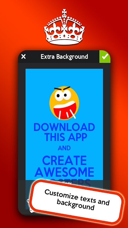 Gardez générateur calme est une marque libre nouveau (gardez le calme et continuez) application pour Android. Vous serez en mesure de modifier la taille, la couleur de fond de texte et le texte et vous avez également une vaste collection d'icônes à définir.