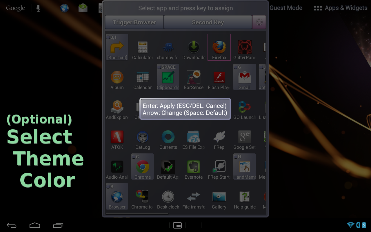 Deuxième clé: enregistrer plusieurs applications et raccourcis pour la palette de sous-lance, qui pop-up lorsque la clé app-lancement poussé.
