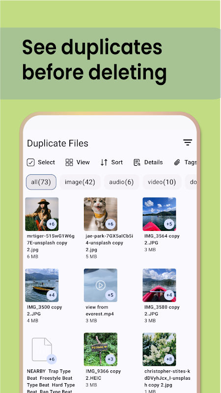 📊 Filtrer et trier — organisez facilement les doublons par nom de fichier, taille ou groupe