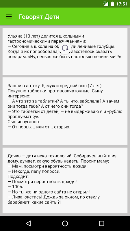 Приложение Kill The Time позволяет загружать и читать развлекательный контент из сети Интернет. Используются пять популярных источников: Цитатник, Истории, Анекдоты, Афоризмы, Говорят Дети. Простое и красивое приложение без рекламы и с материальным дизайном поддерживает копирование целого сообщения по одному клику, чтобы вы могли делиться понравившимися вам цитатами с друзьями через различные мессенджеры и социальные сети. Обновление доступно по движению свайп (движением пальца сверху вниз по экрану телефона), а чтение возможно и в местах, где нет сети или плохой интернет. Поэтому наше приложение скрасит ваше время и поднимет вам настроение в метро или другом общественном транспорте, в очередях или просто, когда у вас будет свободная минутка.