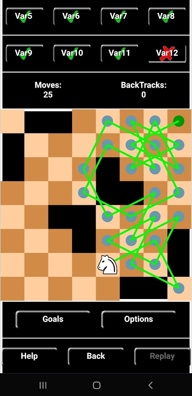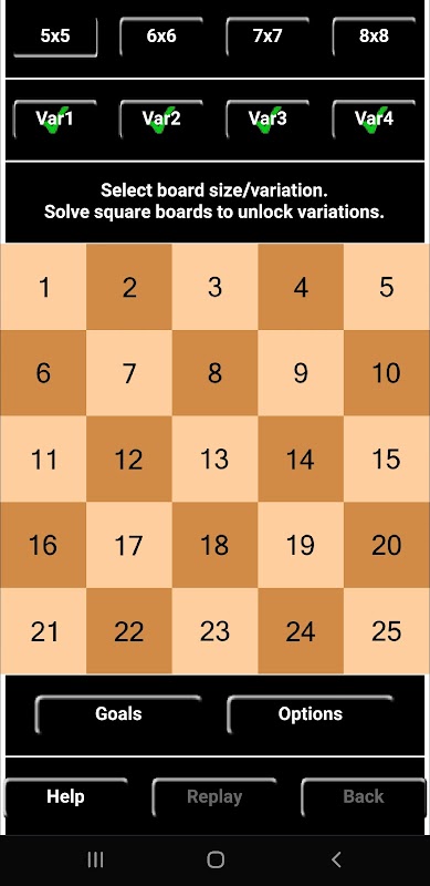 To enable the variations, you must first solve the square board and achieve certain goals. Each square board has four goals, and vary depending on if the board is even or odd : Open and/or Closed solution, Start/End on center square or square 1, solve with Backtracks = 0.