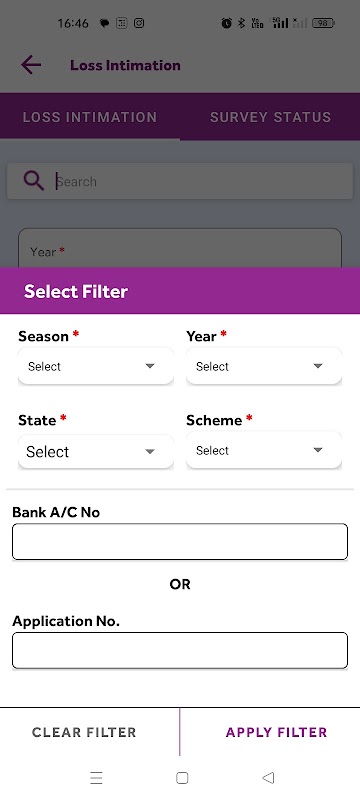 Les agriculteurs peuvent rechercher leur politique en utilisant le numéro de demande ou le numéro de compte bancaire pour afficher les détails de la politique PMFBY et l'état de la réclamation. Lors de la recherche, la possibilité de télécharger le document de politique est également disponible.