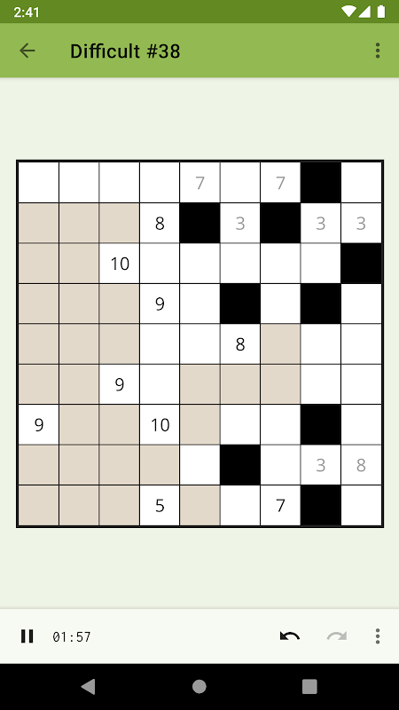 Kuromasu est un casse-tête logique difficile. Trouvez où se trouvent les champs noirs, de sorte que chaque champ avec un numéro ressemble exactement à ce nombre de champs blancs dans les directions horizontale et verticale. Chaque puzzle a exactement une solution, qui peut être trouvée grâce à un raisonnement logique. Aucune devinette n'est nécessaire !