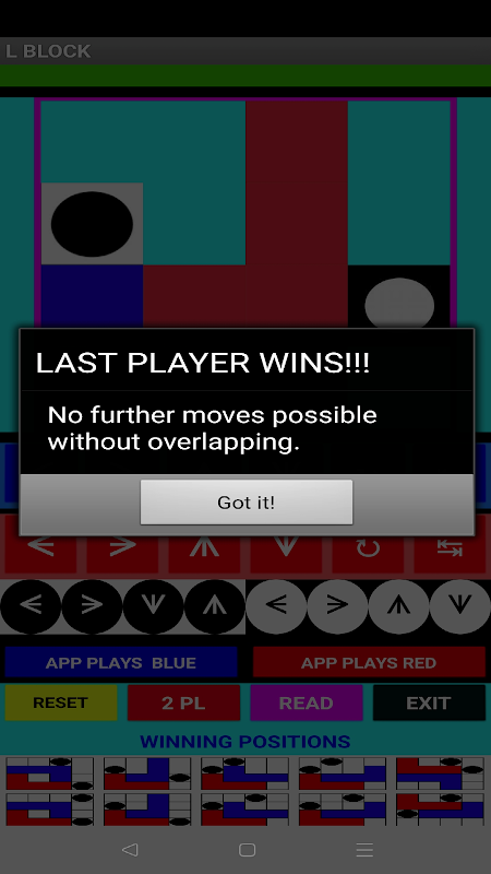 La partie est gagnée si l'adversaire ne peut déplacer sa pièce L sans chevaucher les autres.
