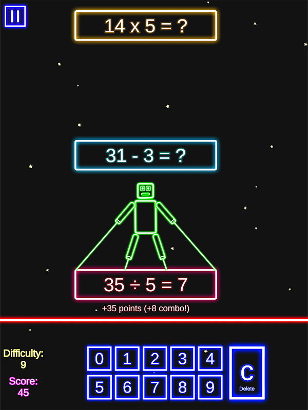 Laser Math est un jeu de mathématiques sur le thème du laser et du néon. Il est conçu pour pratiquer la sommation, la soustraction, la multiplication et la division.