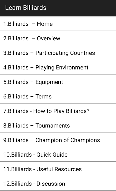 Billiards is a game that can be compared to the game of carom. In this game cue is used as a striker and balls are to be put into the pockets. This Learn Billiards App lets you know about the game, its rules, and the method of playing.
